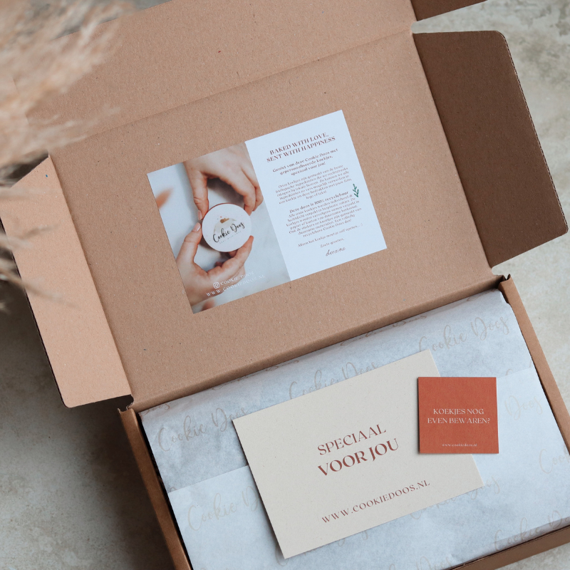 Wanneer de koeken individueel verpakt zijn in milievriendelijke zakjes en ieder voorzien van een veganistische ingredient sticker, worden de koeken samen verpakt in een duurzame verzenddoos. Deze dozen worden geproduceerd uit gecertificeerd FSC(R)papier. Overige ruimte in de doos wordt opgevuld met geryclede strookjes papier. Dit maakt het tot een100% biologisch afbreekbare verzendverpakking.